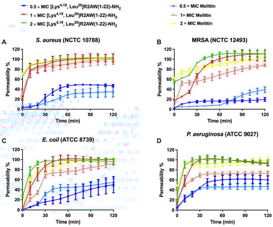 2.7. Membrane Permeability of S. aureus, E. coli, MRSA and P. aeruginosa by [Lys4,19, Leu20]R2AW(1-22)-NH2
