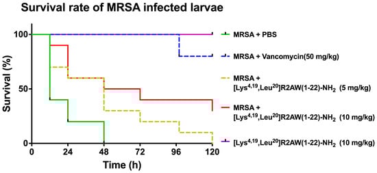 2.8. Treatment of MRSA-Infected Waxworms with [Lys4,19, Leu20]R2AW(1-22)-NH2