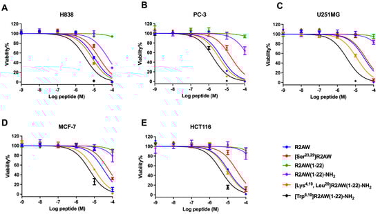 2.9. Antiproliferative Activity of Designed Analogues of R2AW against Cancer Cells