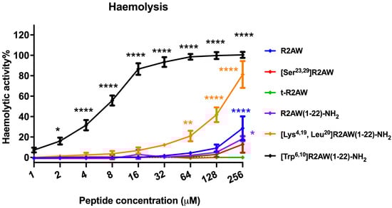 2.11. Haemolytic Activities of R2AW and Its Designed Analogues