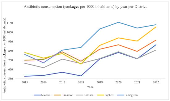 We examined the consumption of antibiotics by analyzing the sales data from retail pharmacies across all five districts in Cyprus (Larnaca, Famagusta, Nicosia, Paphos, and Limassol) for the period from 2015 to 2022.