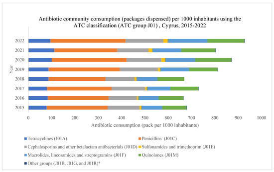 Community antibiotic consumption in Cyprus was classified under the ATC classification (ATC group J01) for the study period from 2015 to 2022 (Figure 2). The J01 sub-groups whose consumption per 1000 inhabitants presented an increase within the community during the study period included the following: sulfonamides and trimethoprim (J01E); macrolides, lincosamides, and streptogramins (J01F); and quinolones (J01M). Consequently, J01E, J01F, and J01M demonstrated the biggest increases of 125.0%, 93.2%, and 49.1%, respectively. The changes in antibiotic consumption over the study period of 2015–2022, using the ATC classification, are shown in Table 3