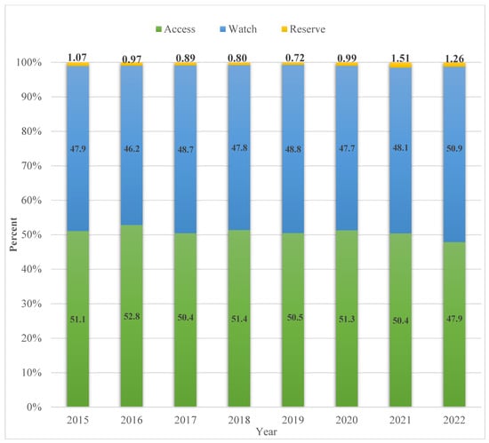 We analyzed available data from 2015 to 2022, using the WHO’s AWaRe classification of antibiotics, a tool developed by the WHO to promote prudent antibiotic use at all levels of healthcare: local, national, and global [13]. Antibiotics were divided into 3 categories—‘Access’, ‘Watch’, and ‘Reserve’—based on their potential to contribute to AMR and the need to use them judiciously. This study investigated the consumption of antibiotics classified as ‘Access’ group antibiotics in the Cypriot community sector from 2015 to 2022. The findings were compared to the World Health Organization’s (WHO) target of at least 60% of total antibiotic consumption being from ‘Access’ group antibiotics [13].