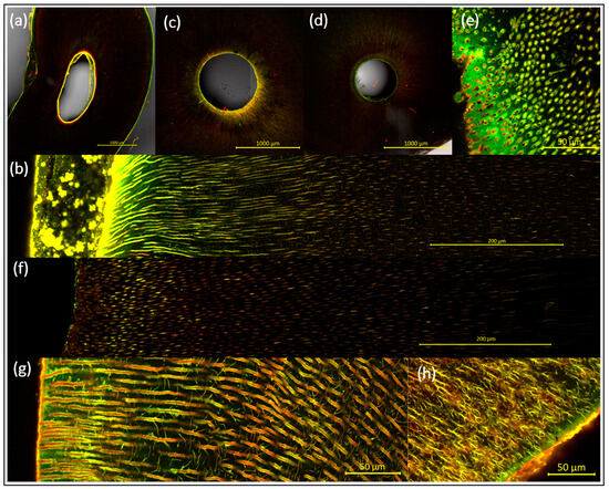 Uninoculated root canals with sections at various magnifications and after LIVE/DEAD staining. The edge of the pulp cavity and the outer tooth surface can be seen as fluorescent lines; before (a,b) and after (c–h) pretreatment with either Pr1 ((c), with NaOCl) or Pr2 ((d–h), without NaOCl). The smear layer, patient-borne microorganisms, and odontoblasts are stained due to intracellular/extracellular DNA/RNA and are thus visualized inside the root canal and tubules even before inoculation ((a), overview with a 3 × 3 tile scan; (b), detailed, with a 9 × 2 tile scan). Before microbial inoculation, it had to be ensured that the dentinal tubules were open, clear, and unimpeded/debris-free. Details are shown of pretreated tubules sectioned transversely (e) or longitudinally (f,g). Many details of the root histology become visible here with this preparation and staining protocol—for instance, the mantle dentine with branched tubules at the root surface (g,h). In the latter images, for better visualization, the contrast was increased in comparison with all the other images.