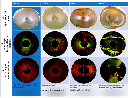 Sclerosis grading (SCG) from 0 to 3 with examples. Transverse slices of roots with increasing degrees of sclerosis presented by light stereomicroscope images (row A) and CLSM-guided imaging, the latter either without irrigation (row B) or with sonically assisted (EDDY) irrigation (row C). For best results, the pretreatment protocol Pr2 (without NaOCl) was applied. Inoculation was carried out with 15 µL of 106 CFU Enterococcus faecalis in 200 µL 0.5 × Müller–Hinton broth, followed by 3–4 weeks of incubation in the case of SCG1–3 (process A) or centrifugation in the case of SCG0 (process B). The arrow ↓ indicates the centrifugal force. Grade 0: no sclerosis; radial inoculation pronounced in the direction of centrifugal force. Grade 1: little or no butterfly pattern. Grade 2: the butterfly-like pattern of oral-vestibular bacterial invasion (visualized by the red lines) and—in contrast—the dark area of sclerosis in a mesiodistal direction can be seen ↕. Grade 3: the multiple fracture lines should be noted (red circles). Vital cells are stained green by SYTO 9, whereas membrane-defective and/or dead bacteria—as well as extracellular DNA/dsRNA—are stained red by propidium iodine. Fracture lines show yellow-green fluorescence, probably due to dye precipitation and/or reflections.