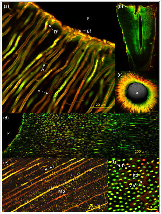 Inoculated root canals with sections at various magnifications and after LIVE/DEAD staining. Inoculation was carried out after pretreatment of the roots with either Pr2 ((a–c), without NaOCl) or Pr1 ((d–f), with NaOCl). The model organism applied was Enterococcus faecalis, incubated for 3–4 weeks after inoculation. In (a) the following details can be observed: root canal wall of pulp (P) with attached fresh biofilm (Bf) (orange layer), intratubular cells of E. faecalis (Ef), anastomoses (A), and Y-ramification (Y). (b) An example root in longitudinal section (scale bar 1000 µm). (c) Cross-section showing staining of the entire dentin disc after pretreatment with NaOCl (A-Pr1) (scale bar 1000 µm). (d) Dentine tubules sectioned longitudinally with patterns of vital E. faecalis. (e) Details of the mantle dentine with microbranches (Mb) that have anastomosed (A) with other microbranches. For better visualization, the contrast was increased in comparison with all other images here. (f) Detailed view of dentine tubules with E. faecalis in dentine sectioned transversally. Peritubular dentine is stained reddish (Ptd) in contrast to the unstained intertubular dentine (Itd).