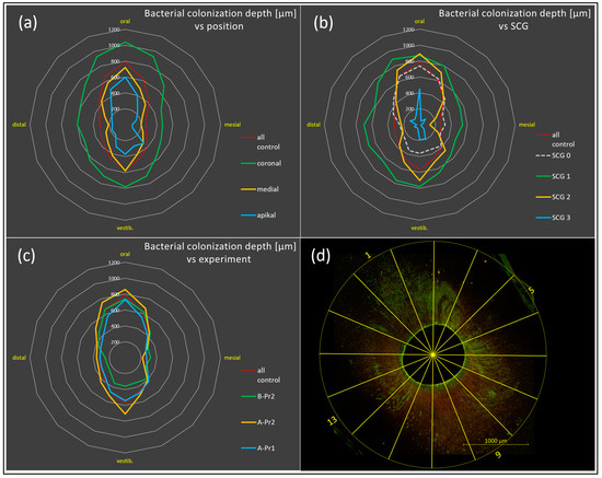 Radar charts showing dependency of bacterial colonization depth (in µm) on position: apical to coronal (a), sclerosis grade (SCG) (b), and three experimental settings, combining process A/B with pretreatments Pr1/2 (c). Overall, A-Pr2 produced the greatest penetration depths in less sclerotized teeth in the coronal area. For all experiments, penetration in the oral-vestibular (ov) direction was significantly greater in comparison with the mesiodistal (md) areas, except for the centrifugation experiment as applied to nonsclerotized teeth only. (d) Example CLSM image showing the 16 segments (arcs) of a circle of measurement.