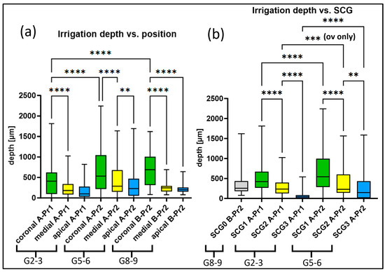 Statistical analysis of irrigation depths (in µm) depending on two parameters: (a) position from apical to coronal, (b) sclerosis grade (SCG); means and 25–75% quantiles are given for both (compare with Figure 4). ** < 0.01, *** < 0.001, **** < 0.0001. ov—oral-vestibular.