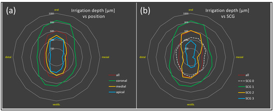 Radar charts showing dependency of irrigation depth (in µm) on position ((a), apical to coronal) and sclerosis grade (SCG) ((b), SCG0–3), which both have a highly significant impact (compare with Figure 6).