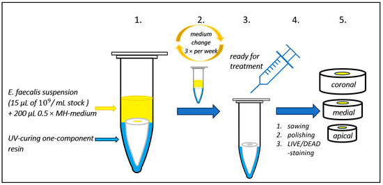 As an innovation, a new overflow model for inoculating teeth (tubules) inside-out with E. faecalis is named and introduced here. The roots were placed in sterile 1.5 mL Eppendorf tubes. The gap between the tube and the root was sealed using UV-curing, one-component resin (Eukitt 4400 LB; Walter Messner GmbH, Oststeinbek, Germany) and cured for 20 min using a light polymerization box (KARLO; Walter Messner GmbH, Oststeinbek, Germany). The resin was used to prevent bacteria from entering via side channels or gaps in the cement outside-in. The upper coronal surface with the root canal entrance remained uncovered. After this manipulation and before inoculation the next day, the fixed root models were sterilized by autoclaving. Root canals (and tubules as far as possible) had to be dried of any water with sterile paper points before inoculation to ensure the access of nutrient-rich medium. The overflow experimental model is shown in Figure 8 and all procedures (steps 1–5, summarized as process A) are described below (Table 2).