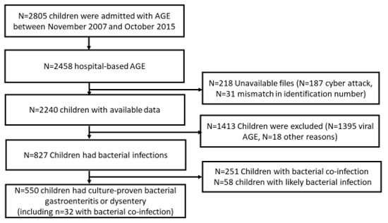 - Wi, D.; Choi, S.H. Antibiotic prescribing practices and clinical outcomes of pediatric patients with Campylobacter enterocolitis. Children 2022, 10, 40. [Google Scholar] [CrossRef]