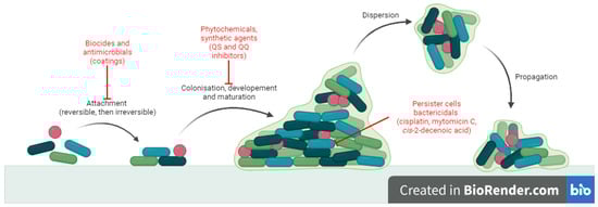 There is a constant need to develop alternative antibiofilm strategies, and extensive research has been conducted in this direction [10]. Antibiofilm small molecules are relevant because they target stages in biofilm development which are different to those of normal planktonic state [9]. The mechanisms (Figure 1) may involve: blocking microbial adhesion (biocides [14], antibiotics [15] and impregnated coatings [16]), inhibition of microbial communication (quorum sensing inhibitors and quorum quenching) [17] and killing cells inside the biofilm (persisters or non-growing cells) (cisplatin, cis-2-decenoic acid, colistin, mytomicin C) [18,19,20,21]. In particular, strategies like quorum sensing inhibition may prove useful because they do not necessarily affect bacterial growth but they reduce virulence, thus increasing susceptibility of microorganisms to antibiotics and to host immune cells without the risk of antibiotic resistant [17].
