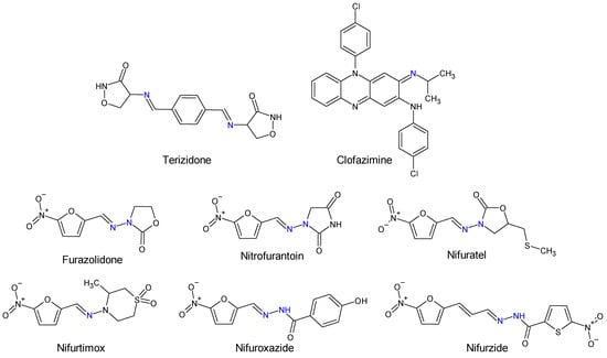 Human and veterinary therapy benefits from several antibacterial drugs recognized as Schiff bases. In multidrug-resistant tuberculosis (MDR-TB), a longer treatment regimen includes two Schiff bases which act on Mycobacterium tuberculosis cell wall: bacteriostatic terizidone (Figure 2), a cycloserine derivative, analogue of D-alanine and anti-leprosy clofazimine, which is an iminophenazine [63,64].