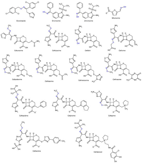 Oximes and hydrazones are moieties frequently used in medicinal chemistry. Examples of oxime drugs utilized in antimicrobial therapy include: cephalosporins (second-generation—cefuroxime, third-generation—cefdinir, cefixime, cefpodoxime, ceftazidime, cefmenoxime, ceftizoxime, ceftriaxone, cefotaxime, cefpirome, fourth-generation—cefepime, fifth-generation—ceftaroline, cefiderocol) [65,66,67,68], as well as antifungal (oxiconazole) [69], antiviral (enviroxime, zinviroxime) [70,71] and anti-infective (nifuroxime) medications [72] (Figure 2 and Figure 3).