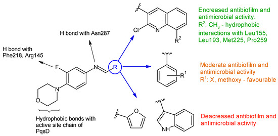 Linezolid derived Schiff bases were synthesized starting from 4-(4-amino-2-fluorophenyl)-morpholine in order to obtain PqsD enzyme inhibitors [106]. Biofilm inhibition varied according to radical R used. The quinoline derivatives (N-((2-chloroquinolin-3-yl)methylene)-3-fluoro-4-morpholinoaniline—15h, N-((2-chloro-8-methylquinolin-3-yl)methylene)-3-fluoro-4-morpholinoaniline—15i) exhibited the greatest activity against P. aeruginosa biofilm (15h—IC50 12.97 ± 0.33 μM,15i—IC50 15.63 ± 0.20 μM), surpassing linezolid (IC50 15.93 ± 0.18 μM). They also presented good anti-Pseudomonas activity, comparable to linezolid (MIC 2.5 μg/mL) and antimicrobial action against E. coli and B. subtilis (15h, 15i: MIC 5–10 μg/mL, linezolid: MIC 2–3 μg/mL). The docking studies of 15h and 15i against PqsD enzyme revealed van der Waals interactions, hydrophobic bonds (methylene groups of morpholine, methyl group of quinoline) and hydrogen bonds (fluorine atom of linezolid moiety, azomethine group) with amino acid residues of the active site (Figure 4). The phenyl derivatives (15a–e) exhibited only moderate antibiofilm and antimicrobial activities, with electron-donating groups (halogen and methoxy) slightly increasing the effect. Indolyl (15g) and furanyl (15f) derivatives presented no enhancement (Figure 4) [106].