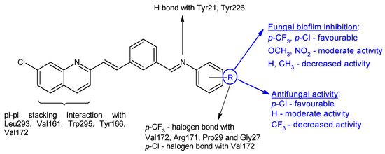 N-(3-(-2-(7-chloroquinolin-2-yl)vinyl)benzylidene)anilines 16a–j were synthesized based on 2-n-heptyl-4-hydroxyquinoline (HHQ) and 2-n-heptyl-3-hydroxy-4(1H)-quinoline (PQS- Pseudomonas Quinoline Signal) [107]. Radical R on the phenyl ring influenced antimicrobial and antibiofilm activities. Electronegative substituents improved antibacterial activity, with the p-chloro derivative 16b being more potent than ciprofloxacin (MIC 50 μg/mL) on E. coli, while the p-trifluoromethyl derivative 16g was the only one active on P. aeruginosa (MIC 91.5 μg/mL). S. aureus was most sensitive to o-trifluoromethyl derivative 16e (MIC 55.3 μg/mL). For antifungal activity, the p-chloro substitution was beneficial, followed by unsubstituted derivative, while the p-trifluoromethyl derivative presented lower activity (16f: IC50 174.4 μg/mL). Compounds with electronegative substituents such as trifluoromethyl (N-(3-(2-(7-Chloroquinolin-2-yl)vinyl)benzylidene)-4-(trifluoromethyl)aniline—16g, or chloro (N-(3-(2-(7-chloroquinolin-2-yl)vinyl)benzylidene)-4-chloroaniline—16b) on para position presented good fungal antibiofilm activity, comparable to fluconazole (IC50 40 μM), whereas methoxy (16h) and nitro (16i, 16j) derivatives indicated moderate activity (IC50 < 100 μM). The lack of substitution or hydrophobic groups (CH3) was unfavourable for biofilm inhibition (Figure 5). Docking studies against agglutinin-like protein (C. albicans Als-3 adhesin) indicated the formation of halogen bonds between para electronegative substituents and the active site, hydrogen bonds between imine group and Tyr21 and Tyr226 and π-π stacking interaction between naphthyl ring and Leu293, Val161, Trp295, Tyr166 and Val172 (Figure 5) [107].