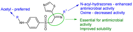 Starting from sulfathiazole, antistaphylococcal compounds were obtained by the isostere replacement of the nitrogen atom of a sulphonamide fragment by methylene carbonyl group, resulting in 2-(4-aminobenzene-1-sulfonyl)-1-(1,3-thiazol-5-yl)ethan-1-ones [148]. Through the continued optimization of these structures, the carbonyl fragment was changed to the imine group, resulting in oximes, hydrazones and N-acylhydrazones analogues [119]. The imine group was introduced in order to improve solubility and antimicrobial potential, while radical R and R1 modulated activity. Biological assay revealed that the ethyl imine group is beneficial for activity. Acetylated derivatives are preferred over simple amines. N-acyl-hydrazones were the most active against tested strains, with hydrazones being favourable and oximes decreasing the activity (Figure 8). Compound 31f (N-(4-((2-(2-picolinoylhydrazono)-2-(thiazol-2-yl)ethyl)sulfonyl)phenyl)acetamide) was bactericidal against E. faecalis, standard and clinical isolates at MIC 1–4 μg/mL, surpassing norfloxacin (MIC 4–8 μg/mL) and sulfathiazole (MIC 128 μg/mL). It was also able to reduce the biofilm mass of E. faecalis by 35% at 6xMIC. Some possible mechanisms of action for compound 31f are membrane damage, oxidative damage, inhibition of dihydrofolate synthetase and complexation of DNA [119].