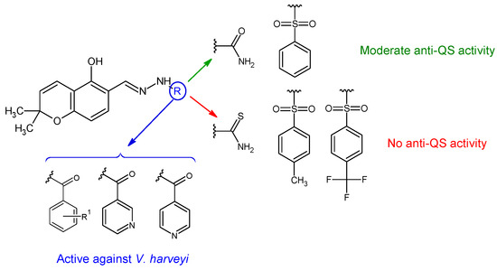 Hydrazones of 5-hydroxy-2,2-dimethyl-2H-chromene-6-carbaldehyde with different aryl, sulfonyl and non-aryl hydrazines were obtained and evaluated for QS inhibition and antibacterial activity [124]. Sulfonyl derivative ((E)-N’-((5-hydroxy-2,2-dimethyl-2H-chromen-6-yl)methylene)benzenesulfonohydrazide—36f) and semicarbazone (36a) exhibited moderate anti-QS activity (IC50 22 μM, respectively 27 μM), but no antibacterial effect against V. harveyi. Substitution on the sulfonyl ring with hydrophobic groups (methyl, trifluoromethyl) or changing the urea to thiourea abolished anti-QS effect (Figure 9). Compounds 36d (4-OH), 36c (H), 36e (2,4-diOH), 36i and 36j (pyridyl) presented antibacterial activity against V. harveyi (MIC 3.9, 7.8, 10.0, 10.0, 15.6 μM). Compound 36e was the only one active against S. aureus (MIC 64 μg/mL) without effect on E. coli [124].