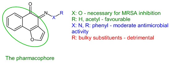 Antistaphylococcal furanoquinone derivatives (oximes, hydrazones) (42, 43) were synthesized starting from naphto[2,3-b]furan-4,9-dione and naphto[1,2-b]furan-4,5-dione [130]. Based on biological evaluation, structure–activity relationships revealed that naphto[1,2-b]furan-4,5-dione is essential for activity, while linear furanoquinones are inactive. Oxime group (X: O) is necessary for MRSA inhibition, with small radicals (R: H- 43a, COCH3- 43b) being favoured over bulky substituents. Phenyl radicals coupled with hydrazine linker (X: N) showed moderate activity and were inferior to oximes (Figure 10). Thus, (Z)-4-(hydroxyimino)naphtho[1,2-b]furan-5(4H)-one (43a) and (Z)-4-(acetoxyimino)naphtho[1,2-b]furan-5(4H)-one (43b) were the most active of the series, being active against planktonic and sessile forms of MRSA. They exhibited bactericidal action against S. aureus standard strains, drug resistant strains and clinical isolates. They were able to penetrate MRSA biofilm and completely inhibit bacteria outside the matrix at 100 μg/mL, surpassing cetylpyridinium chloride. Bacteria inside the matrix were less susceptible, with a reduction of 4-log CFU being observed for hydroxy at 100 μg/mL. Biofilm height was reduced to half by both compounds. They also presented activity against MRSA-infected wounds with minimum skin irritation. The mechanism of action seemed to be inhibition of DNA gyrase (43a, 43b) and RNA polymerase (43a) [130].