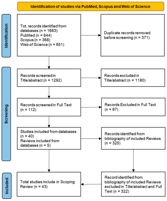 The literature search retrieved 1663 articles (Figure 1): 644 from PubMed, 368 from Scopus, and 651 from Web of Science. After the removal of duplicates (n = 1292 articles remaining), the title/abstract screening resulted in the exclusion of 1180 articles. The remaining 112 articles were screened in full text, and 45 were included in the scoping review [10,11,12,13,14,15,16,17,18,19,20,21,22,23,24,25,26,27,28,29,30,31,32,33,34,35,36,37,38,39,40,41,42,43,44,45,46,47,48,49,50,51,52,53,54]. Of these 45 articles, 5 were systematic or scoping reviews. Additional records (n = 325) were identified through checking the references of the included systematic and scoping reviews retrieved from the primary search. Of these, three articles were included in the final version of the scoping review [55,56,57]. In Figure 1, we reported the PRISMA flowchart of the screening phases. The reason for excluding full text articles is given in the Supplementary Materials.