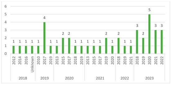 Figure 2. Number of articles for the last year of study grouped by year of publication.