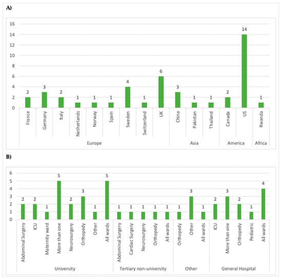 Figure 3. (A) Number of articles per country of study grouped by continent. (B): Number of articles per ward grouped by setting.