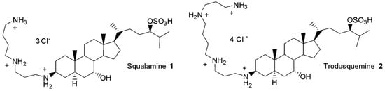 In 1993, squalamine 1 and trodusquemine 2 (Figure 1) were identified as the first na-tural aminosterols from the dogfish shark, Squalus acanthias, to exhibit potent antimicrobial activities against both Gram-positive and Gram-negative MDR bacterial species [12,13].