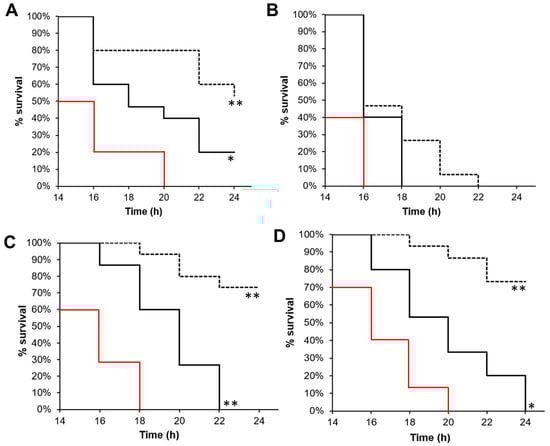 4f and squalamine antivirulence activities. Survival curves of G. mellonella inoculated with (A) CRAB, (B) CRPA, (C) MRSA, or (D) VRE and treated 2 h post-infection with physiological solution (red line, control), ¼ MIC of squalamine (solid black line), or 4f compound (dotted black line), as described in the methods section. Log-rank test * p < 0.01, ** p < 0.001.