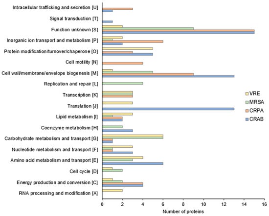 Functional COG classification of CRAB, CRPA, MRSA, and VRE differentially expressed proteins (fold change > 1.4, p-value < 0.05).