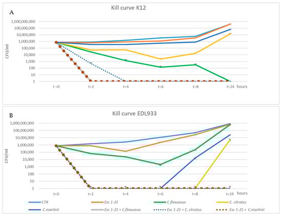 Time–kill curves of C. citratus, C. flexuosus, C. martinii and Esc(1–21) alone or in combination against EDL933 (A) and K12 (B) strains. Each component alone and in combination was used at ¼ of the respective MICs. The strains without any treatment were considered to be the control (CTR). The experiments were performed in triplicate. Data were expressed as means ± SDs.