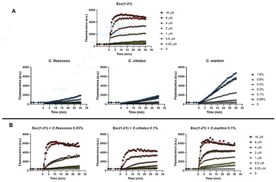 Approximately 1 × 107 CFU/mL, was incubated with 1 μM of Sytox Green in phosphate-buffered saline (PBS) for 5 min in the dark for the stabilization of the fluorescence signal. The cells were then treated with Esc(1–21) or EOs alone and their combinations. We monitored the fluorescence intensity, after the addition of the compounds, for 30 min using the microplate reader (Infinite M200, Tecan, Salzburg, Austria). On graphs, we plotted the recorded changes in fluorescence caused by the binding of the dye to intracellular DNA (λexc = 485 nm, λems = 535 nm). The peptide concentrations ranged from 0.25 to 16 μM, and the EO concentrations ranged from 0.05 to 1.6%; for the combinations, the peptide was tested in scalar concentrations with invariable concentrations of the EOs, which corresponded to those that did not allow planktonic growth in combination with the peptide (FICI value).