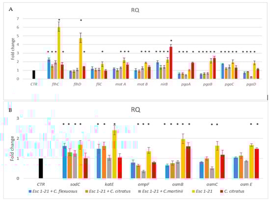 RT-PCR analysis of expression changes in genes related to flagellar system regulation, biofilm formation (A) and oxidative and osmotic stresses (B). Relative gene expressions (RQ) represent transcriptional levels after the exposure of E. coli EDL933 to singular components or mixtures versus the untreated control (CTR). The reference gene 16s rRNA was used to normalize the gene transcription level. Data are expressed as means ± SDs of three independent experiments performed in triplicate. * p ≤ 0.05.