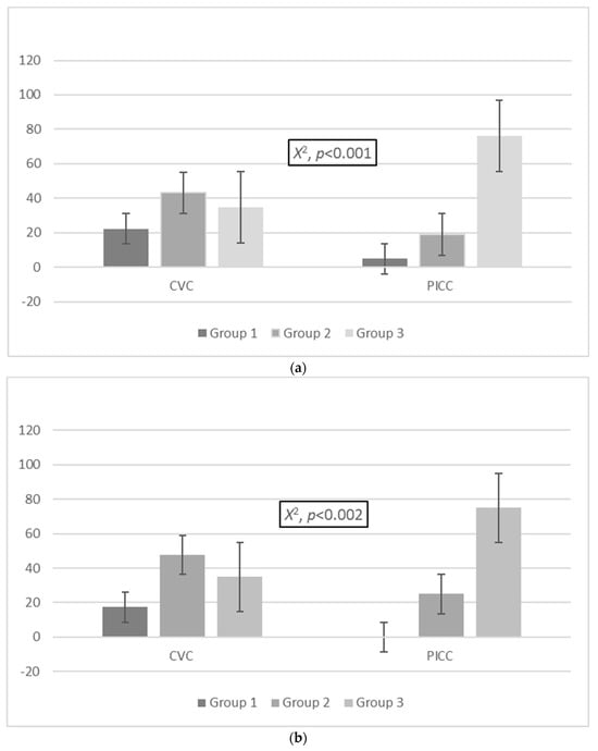 A significant difference in the distribution of colonization events was determined between the three groups in PICCs and CVCs. More specifically, in the CVC cohort, 32/144 (22.2%) colonization events were in group 1, 62/144 (43.1%) were in group 2, and 50/144 (34.7%) were in group 3, while in the PICC cohort, 3/63 (4.8%) colonization events were in group 1, 12/63 (19%) were in group 2, and 48/63 (76.2%) were in group 3 (X2, p < 0.001; Figure 1a). A significant difference in the proportion of MDROs was identified between the three groups in the cohorts of PICCs and CVCs. In the CVC cohort, 15 (17.4%) cases of MDROs were isolated in group 1, 41 (47.7%) were isolated in group 2, and 30 (34.9%) were isolated in group 3. In the PICC cohort, zero (0%) cases of MDROs were isolated in group 1, three (25%) were isolated in group 2, and nine were isolated (75%) from group 3 (X2, p = 0.023; Figure 1b).