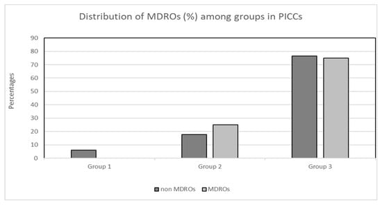 There was no significant difference in the proportion of MDROs to non-MDROs within each of the three groups in both the CVC and PICC cohorts. More specifically, in the PICC cohort, zero (0.0%) MDROs and three (5.9%) non-MDROs were isolated in group 1, nine (17.6%) MDROs and three (25%) non-MDROs were isolated in group 2, and thirty-nine (76.5%) MDROs and nine (75%) non-MDROs were isolated in group 3 (X2, p = 0.61; Figure 2). Concerning the cohort of patients with CVCs, the distribution of MDROs and non-MDROs (%) was as follows: 17 (29.3%) MDROs and 15 (17.4%) non-MDROs in group 1, 21 (36.2%) MDROs and 41 (47.7%) non-MDROs in group 2, and 20 (34.5%) MDROs and 30 (34.9%) non-MDROs in group 3 (X2, p = 0.196; Figure 3).