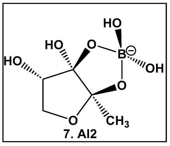 AI-2 furanosyl borate diester complex 7 (Figure 4), which highly resembles the core of the larger boron-containing antibiotics (Figure 3), was isolated from the bioluminescent marine bacterium Vibrio harveyii as one of two autoinducers that regulate light production in this bacterium in response to cell density (quorum molecule) [55,56]. Bacteria communicate using extracellular (hormone-like) signal molecules termed as autoinducers in a process called quorum sensing, which is typically dependent on the cell population size. It has been found that both Gram-negative and Gram-positive bacteria have the necessary enzymatic machinery to produce AI-2 [57]. Thus, the boron-containing AI-2 has been suggested to be the “universal” bacterial QS signal in interbacterial communication [55,56,57,58,59,60,61,62]. That realization has led to the design and synthesis of AI-2 analogs [60,61], as well as various potential AI-2 inhibitors [63,64,65,66,67,68,69,70,71,72]. To date, there are no FDA-approved drugs as AI-2 autoinducer inhibitors, most likely due to the complexity of QS signaling and promiscuity of the receptors which are involved in the synergistic agonism of AI-2 and analogs [62].