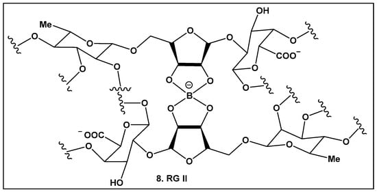 Boron carbohydrate complexes have been isolated from bacteria, seaweed, lichens, and fungi [9,10], with boron alcohol complexes from higher plants discovered close to half a century ago [73]. Their representative, Rhamnogalacturan II (RG-II) (8, Figure 5), is one of the most complex carbohydrates ever found in nature [73]. RG-II is found in the primary cell walls of all vascular plants [74,75,76,77,78,79]. The borate crosslinking in this carbohydrate is required for the normal plant development and growth, and its production requires an array of different proteins [74,75,76,77,78,79,80,81]. Mutations leading to alterations in the RG-II structure also affect crosslinking and could lead to severe impaired growth or even to plant death [82]. Beyond plants, RG-II has been recently identified as a Toll-like receptor 4 agonist that inhibits tumor growth by activating dendritic cell-mediated CD8+ T cells [83] in mammals.