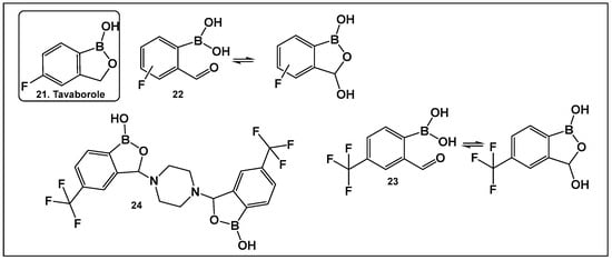 Structures of oxaboroles: FDA-approved antifungal agent Tavaborole, 21; fluorinated derivatives of 2-formylphenyl boronic acids, 23, 24, designed as antibacterials and antifungals.