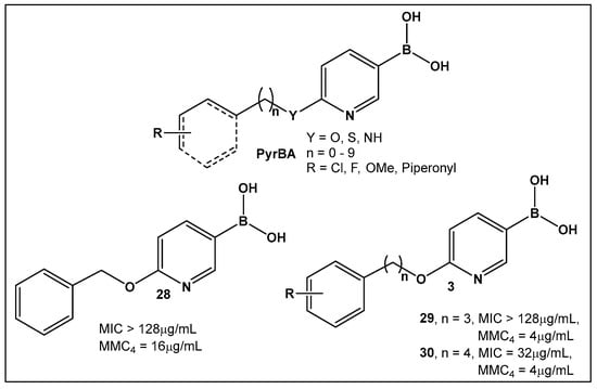 Potential inhibitors of the NorA efflux pump of Staphylococcus aureus were screened using a library of 150 heterocyclic boronic acids. Those with a pyridine-3-boronic acid scaffold (PyrBA, Figure 14) were selected for further development [123,124]. The most promising compound from the initial screen shown to potentiate ciprofloxacin activity in a NorA-overexpressing SA-1199B strain (4-fold increase) was 6-benzyloxypyridine-3-boronic acid 28 (Figure 14). Further structural modification of 28 (Figure 14) led to the second-generation derivatives of pyridine-3-boronic acids, from which compounds 29 and 30 (Figure 14) showed a further 4-fold increase in activity as compared to 28 (Figure 14). These two compounds potentiate the activity of ciprofloxacin and norfloxacin, while exhibiting no significant intrinsic antibacterial activity. Importantly, they do not inhibit the mammalian P-gp efflux pump.