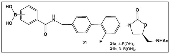 The external incorporation of phenyl boronic acid as a Lewis acid unit in the structure of oxazolidinone, 31 (Figure 15) has led to derivatives based on the N-aryl-oxazolidinones Linezolid and Radezolid with better activity than that of the two antimicrobials [125], with Linezolid considered as the drug of last resort against Gram-positive bacteria-induced infections [126,127,128,129]. Compounds of this type, i.e., 31 (Figure 15), have the unique binding mode of oxazolidinones structural type to the A-site pocket of the 50S subunit of bacterial ribosomes, peptidyl transferase center (PTC), negatively affecting bacterial protein synthesis and growth [130]. It is interesting to note that the Linezolid derivative, compound 31a (Figure 15), demonstrated levels of antimicrobial activity that were eight-fold to thirty-two-fold higher than Linezolid against a panel of Gram-positive strains, and a near to one hundred-fold activity against the Gram-negative E. coli JW5503, a mutant strain with a defective efflux capability (MIC of 0.78 μM for 31a vs. >50 μM for LZD), thus underscoring the potential of efflux pump incapacitation in antimicrobial/anti-biofilm drug development [125].