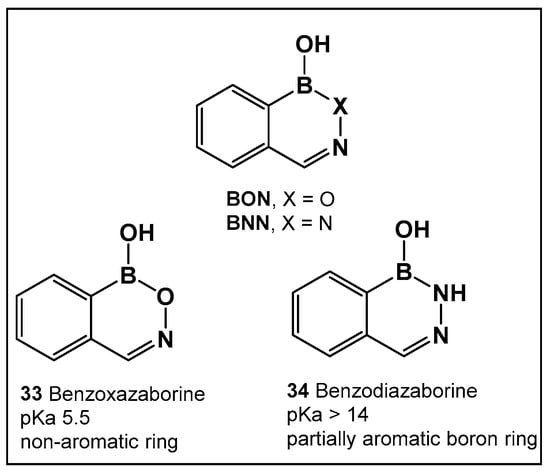 Further exploration of the electronic proximity of boron to carbon resulted in the synthesis of a new chemical scaffold BNN (Figure 17) and the determination of its physicochemical properties [24,139,140]. While benzoxazaborines, BONs (Figure 17), with a boron-containing six-membered ring lack an appreciable aromatic character, they are chemically related to benzoxaboroles due to their moderate acidity (pKa 5.5 for 1a vs. 7.4 for benzoxaborole) [24]. Replacement of the oxygen with a nitrogen atom, however, leads to BNN (Figure 17), the aza-analogs, i.e., benzodiazaborines, which display partially aromatic characteristics, and a much higher pKa. Thus, benzodiazaborines are considered a naphthoid isostere [24,140]. Both compound classes (benzoxazaborines and benzodiazaborines) are soluble and stable in aqueous solutions, a physicochemical property that aids the biological screens [24,140]. Their differences, however, allow for these two compound classes (BON and BNN, Figure 17) to serve as functional mimics of two different “established” chemotypes, namely benzoxaboroles and aromatic scaffolds, e.g., hydroxyquinolines, naphthols, and phthalazinones, respectively.