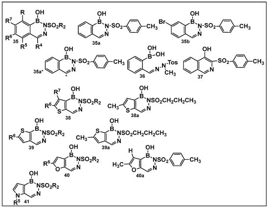 Differently substituted aromatic ring-containing diazaborines: 35-sulfonylbenzodiazaborines,with 35a and 35b as the most active compound of this series against Proteus (12.5 μg/mL), Klebsiella (3.12 μg/mL)and Salmonella ( 6.25 μg/mL), Neisseria gonorrhoeae (2–8 μg/mL) and, to a lesser extent, against Escherichia coli (25 μg/mL and Enterobacter (>50 μg/mL) [144]; 38, thieno[2,3-d]diazaborines are slightly more active than 39, thieno[3, 2-d]-diazaborines in general; the 2-alkyl-sulfonyl derivatives of both 38 and 39 have good activities in vitro and in vivo; compound 38a was chosen for further evaluation. Proteus (0.78 μg/mL), Klebsiella (0.39 μg/mL), and Salmonella (0.78 μg/mL), N. gonorrhoeae (1 μg/mL), E. coli (1.56 μg/mL), and Enterobacter (3.12 μg/mL); 40, the furodiazaborines series follow a similar SAR as the 40 series; the methyl-substituted 40a demonstrates good activity: Proteus (3.12 μg/mL), Klebsiella (1.56 μg/mL), and Salmonella (3.12 μg/mL), N. gonorrhoeae (1–8 μg/mL), E. coli (12.5 μg/mL), and Enterobacter (25 μg/mL); the pyrrolodiazaborines 41 are inactive [144]. * means radioactive-labeled compound.