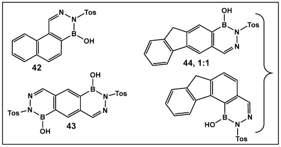 Diazaborines continue to be explored as antimicrobial agents due to their exclusive activity against Gram-negative bacteria, which are notoriously harder to treat. The diazaborine “specialization” is attributed to their well-documented mechanism of action—the inhibition of lipopolysaccharide biosynthesis in Gram-negative bacteria [141]. The SAR of derivatives of the aryl-substituted diazaborines (Figure 18) have been determined. Based on its characteristic, compound 35a (Figure 18) has been chosen for further examination [144,145]. To address the question of whether the bicyclic diazaborines are the active antimicrobial species, the ring-opened analog 36 (Figure 18) and the isoquinoline 37 (Figure 18) were prepared as stable analogs of 35a (Figure 15). Neither of the two derivatives (36 and 37, Figure 18) demonstrated antimicrobial activity similar to 35a (Figure 18). Furthermore, neither the changes in the size or position of the aryl moiety nor the addition of a second diazaborine (compounds 42–44, Figure 19) demonstrated the antimicrobial activity of their mono-aryl counterparts [144].