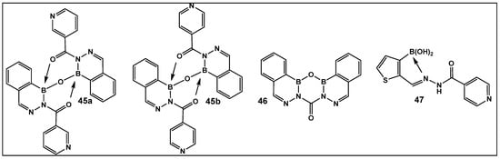 The 2-Acylated benzodiazaborines as well as the heterocyclo-diazaborines (Figure 20) were also prepared and their antimicrobial activity evaluated [147]. From the prepared library of compounds, several demonstrated activity against E. coli. Two others were active against Mycobacterium smegmatis (45b and 47, Figure 20). The finding that these two compounds have isoniazid covalently embedded in their structures suggests that they might be acting as isoniazid prodrugs for M. smegmatis [147].