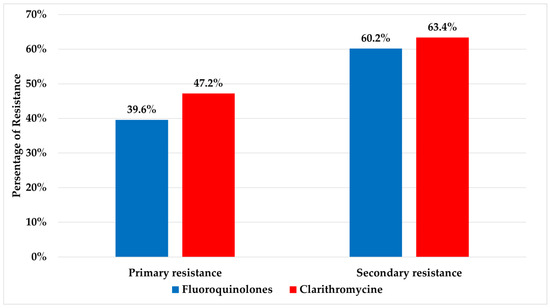 Values of primary and secondary resistance rates to fluoroquinolones and clarithromycin.