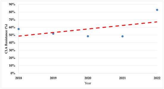 The trend of clarithromycin resistance rates during the study period. CLA—Clarithromycin.