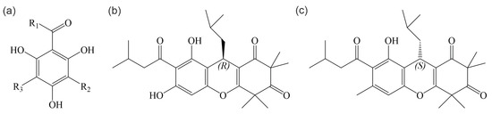 Figure 1. Structures of acylphloroglucinols. (a) General structure of acylphloroglucinol compounds. (b) Structure of (R)-rhodomyrtone. (c) Structure of (S)-rhodomyrtone.