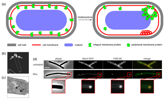 Figure 3. Effects of rhodomyrtone on bacterial cells. (a) Schematic overview of cellular effects. (b) Rhodomyrtone-induced vesicles visualized with structured illumination microscopy. (c) Vesicles visualized with transmission electron microscopy. Membranes were stained with Mitotracker green. (d) Trapping of the integral membrane protein MraY in rhodomyrtone-induced vesicles. Membranes were stained with FM5-95. Panels (bd) show Bacillus subtilis cells and were reproduced from [25].