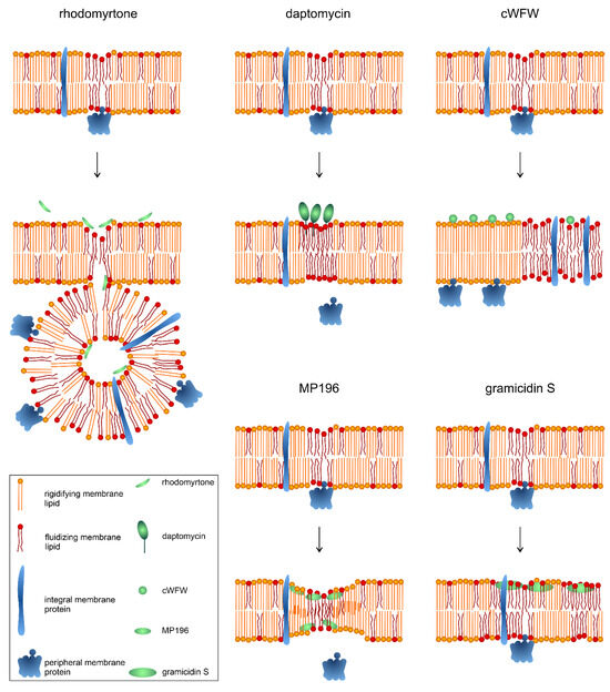 Figure 5. Mechanism of action of rhodomyrtone and other membrane-active compounds on bacterial cell membranes. Figure partially adapted from [78].