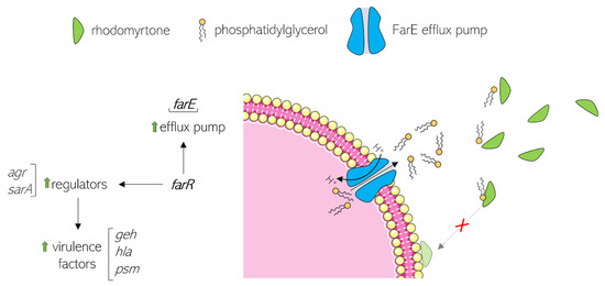 Figure 6. Resistance mechanism of S. aureus against rhodomyrtone according to results by Nguyen et al. and Huang et al. [85,87]. Green arrows indicate upregulation.