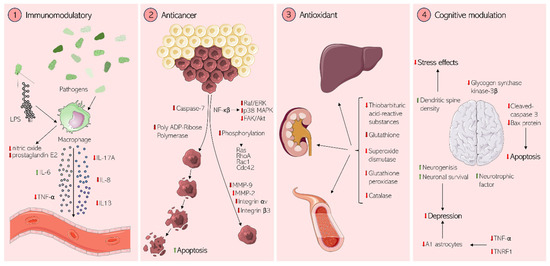Figure 7. Effects of rhodomyrtone on mammalian cells. (1) Immunomodulatory, (2) anticancer, (3) antioxidant, and (4) cognitive effects of rhodomyrtone. Red arrows indicate down-regulation.